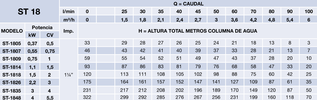 Diámetro impulsiones 11/4“ desde serie 05 a serie 18.