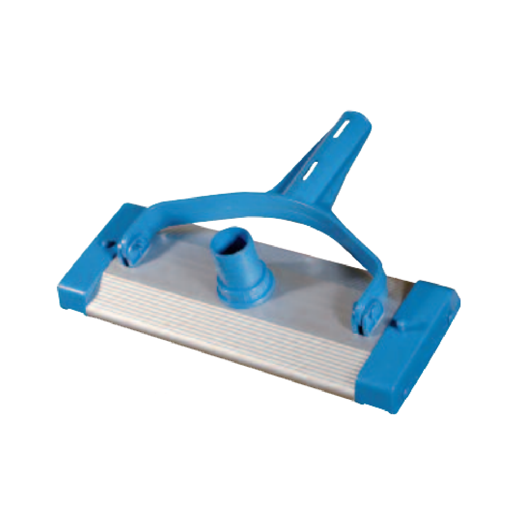 Carro limpia fondos piscina de aluminio con 4 ruedas y cepillo de arrastre. Para manguera de diámetro 38. Conexión para pértiga con tornillo y palomillas.